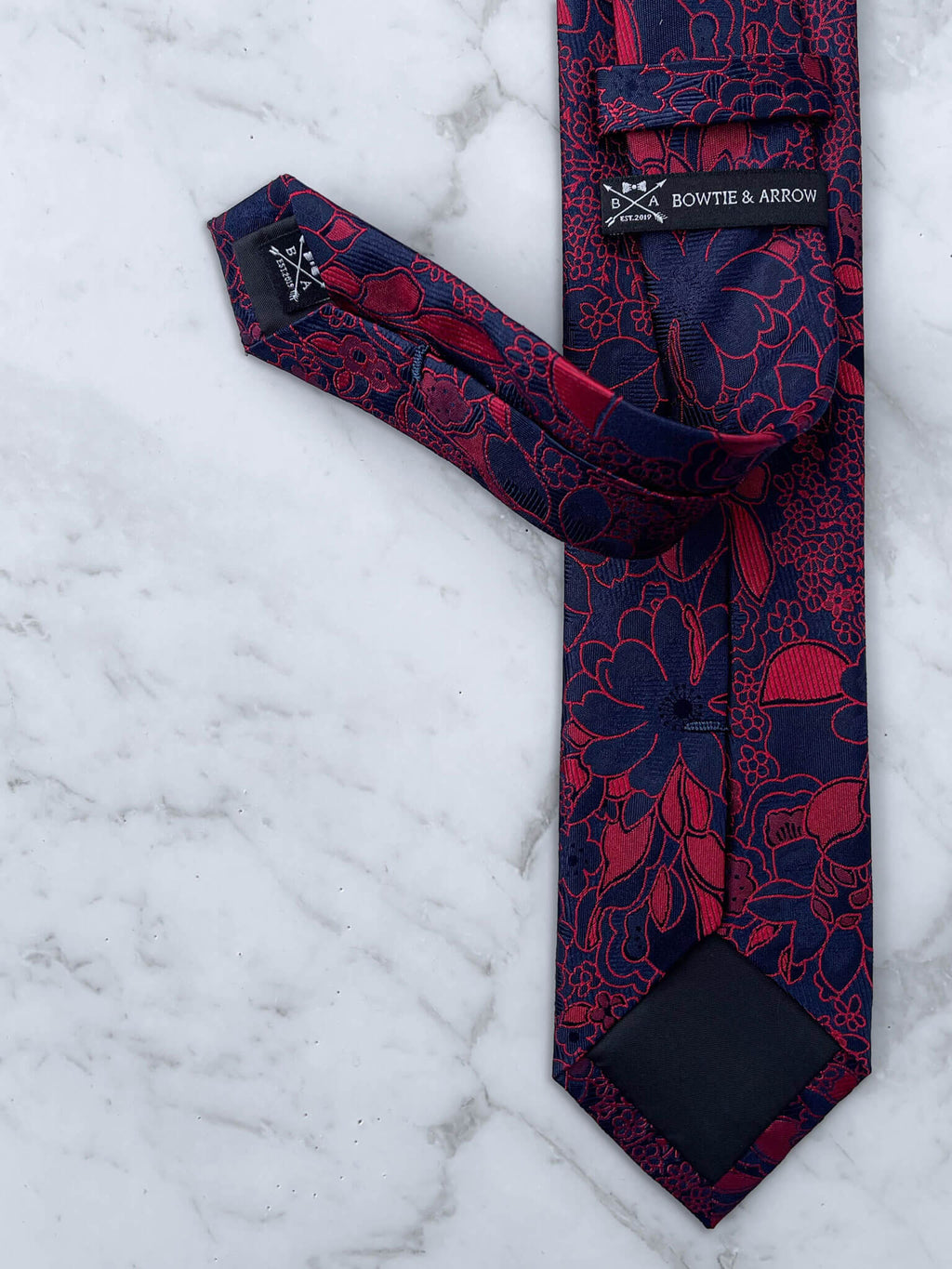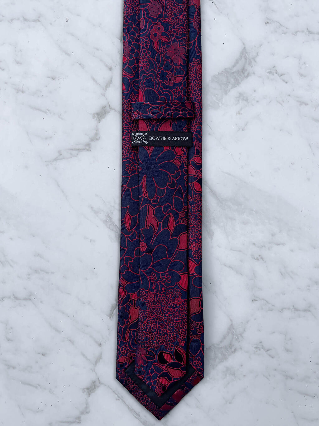 Bold yet refined, the Crimson Bloom Silk Tie features a striking floral pattern woven into deep navy silk with rich crimson accents.